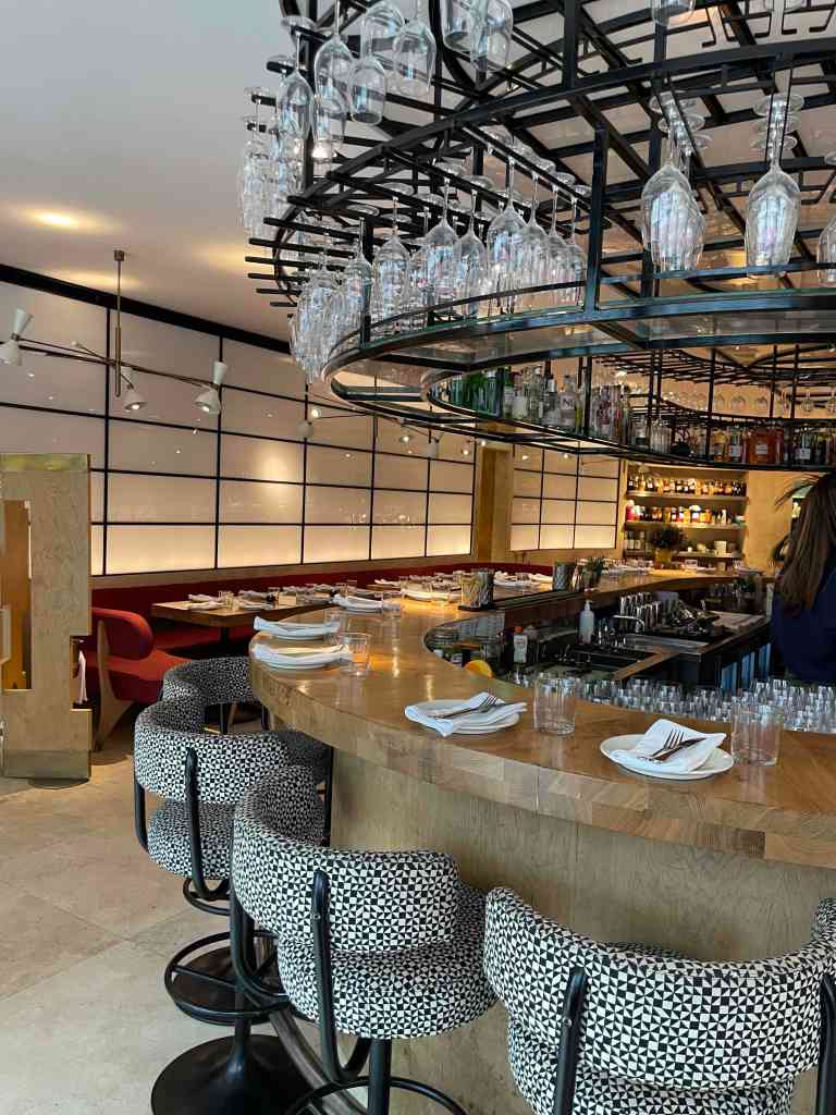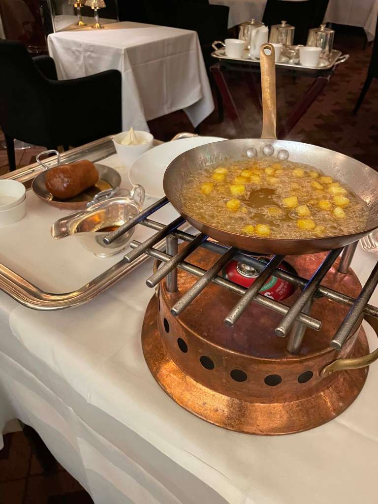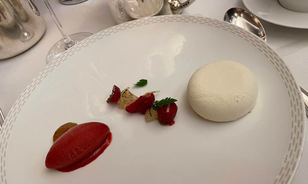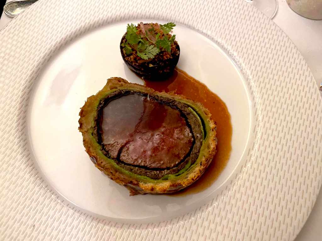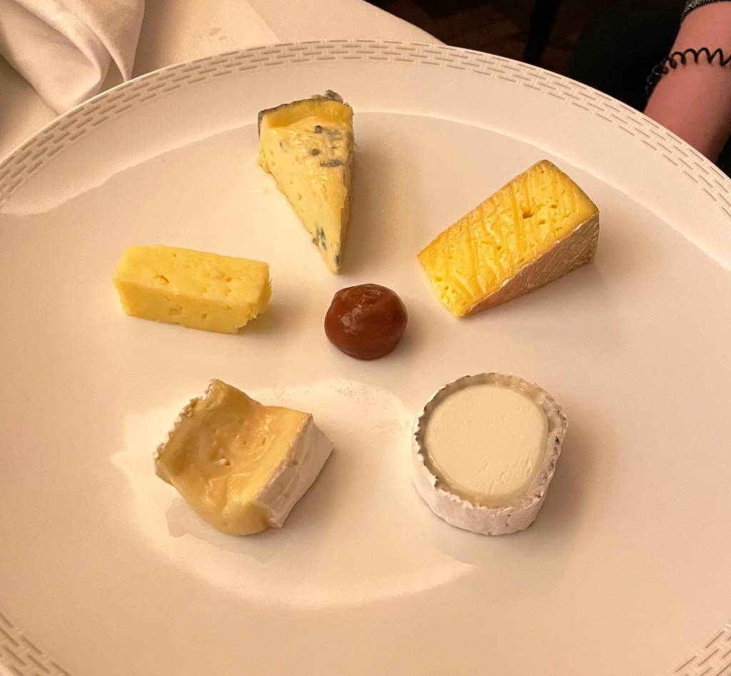 After our drinks, we made our way towards our dining option for the evening – The Savoy Grill by Gordon Ramsay at the very fancy Savoy hotel. C and I have dined here a few times but this was a first for our friends. The interior of the restaurant has a real art deco look to it and is nicely lit and has comfortable well-designed seating areas. The menu is short but reads really well as you would expect. We ordered some drinks – kir royals of course, then ordered our food. To start, I went with the simple heirloom tomato salad, C and one of our chums ordered the smoked haddock soufflé and the other the duck foie gras. My salad was as expected, tasty and fresh, the foie gras rich and really tasty, however it was the haddock that was the star it was delicious. For our mains, two of us went for the duck and two of us ordered the beef wellington. We ordered some fries, pommes purée and charred cabbage as sides. While the duck was good the beef was outstanding. Dessert was next on the list, we ordered tart tartin, cheesecake, rum-baba and a cheeseboard. All fantastic, to say we were full would be an understatement but it did not stop us from hitting a late night bar to finish off a splendid night.