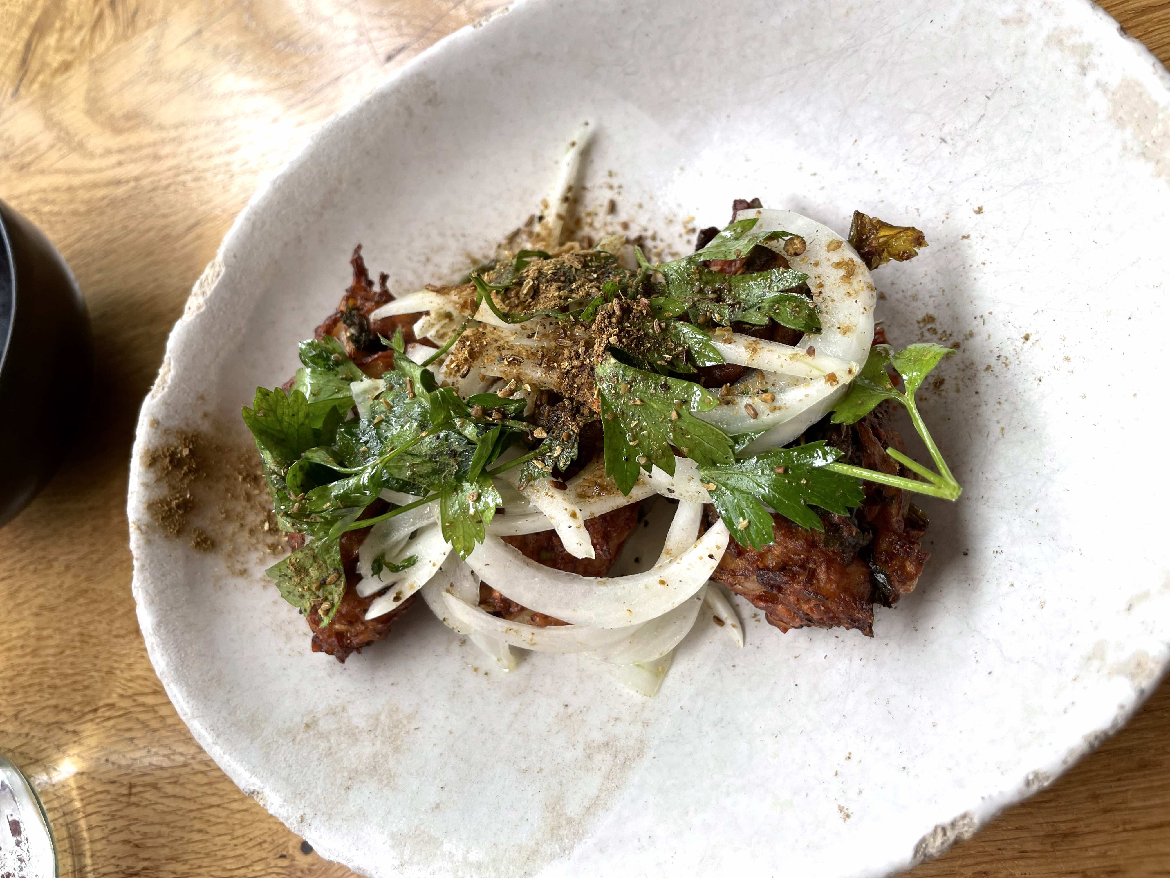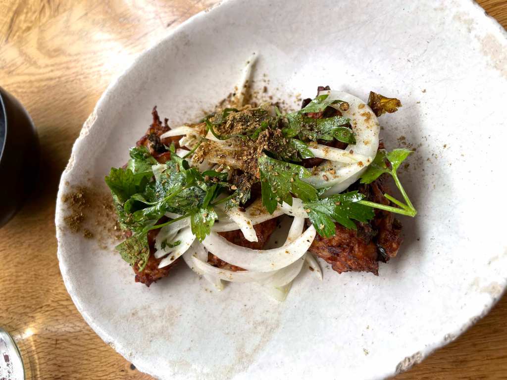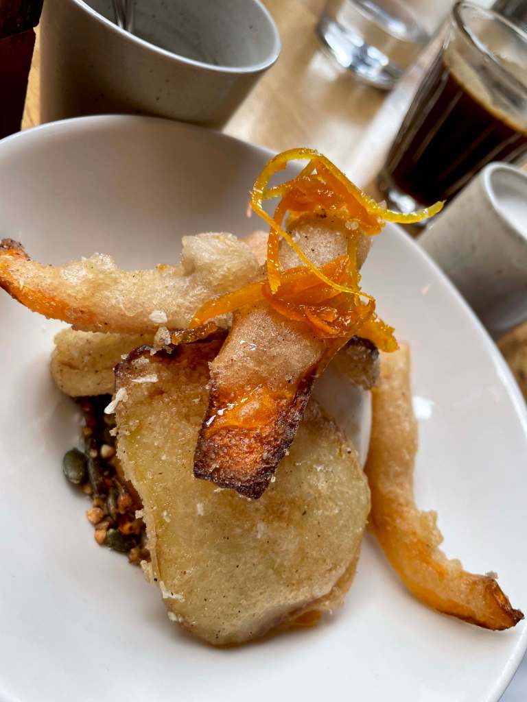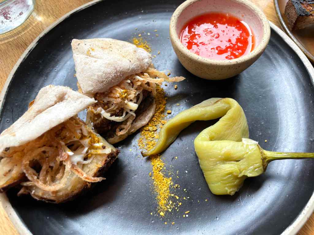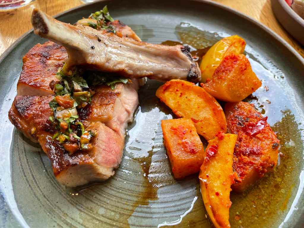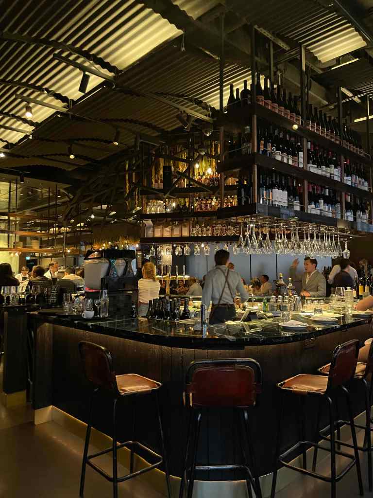 Our next plan was to grab an early dinner before heading to the Olympic stadium for our concert. We decided to chance a walk-in at a restaurant called Rovi, which is owned by Ottolenghi – we’re fans and always try and get to one of his restaurants. We arrived just after 5:00pm as it opened for dinner service. We luckily got a table as by 5:45, the place was full. The menu consists of nibbles; small plates and mains and everything is meant for sharing. We ordered…..