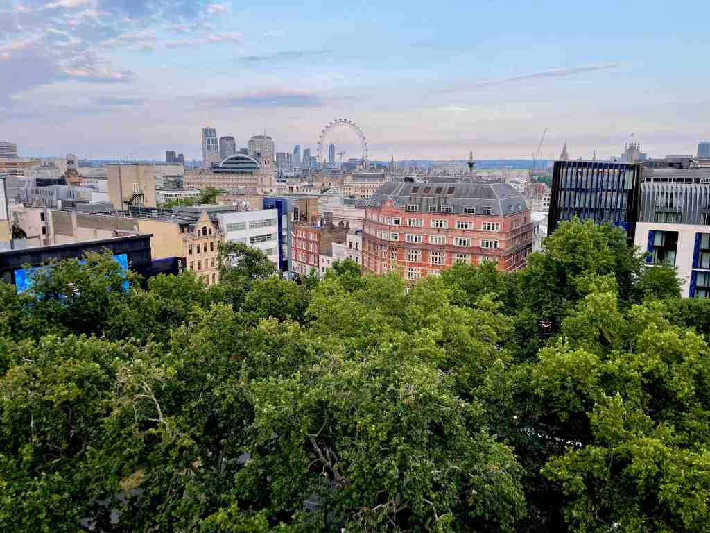 Once checked in, we had about an hour to kill before getting ready to hit the centre of London where we had arranged to meet two friends (from home) who were in London for another concert at the same time. Once spruced up we made our way towards Leicester Square where we arranged to meet our two chums. First things first, a pre-dinner drink in a rooftop bar which offers really good views of the London skyline and despite it being a tad overcast, it was a warm evening.