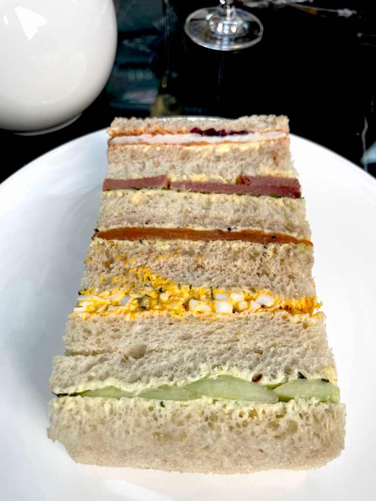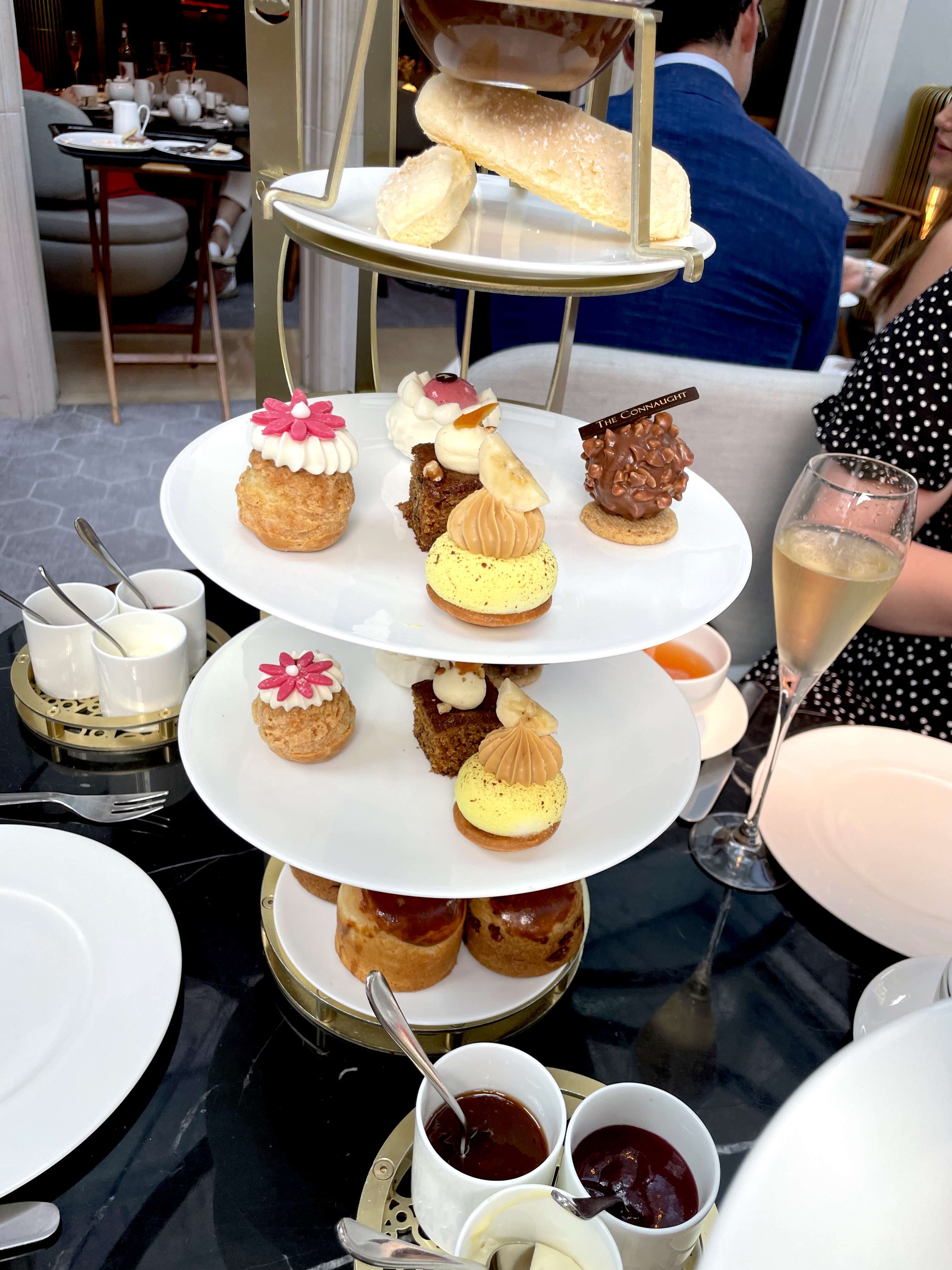 The afternoon tea is served in a really nice conservatory at the front of the hotel and we had a window seat which was nice. To kick things off we ordered some sparkles which went down really well and as one would expect, the service is top notch. As I’ve stated before on our blog, I’ve been disappointed with afternoon tea in the past – it always seems to promise a lot but usually fails to deliver- so how was the afternoon tea at The Connaught hotel. Well, thankfully, not too bad, nothing outstanding but decent. The sandwiches were fine, they could have done with more of a punch of flavour but otherwise they were fine. There were two scone choices, plain and fruit served with clotted cream, strawberry jam and spiced marmalade. Again, these were ok. However the pastries were the best part.