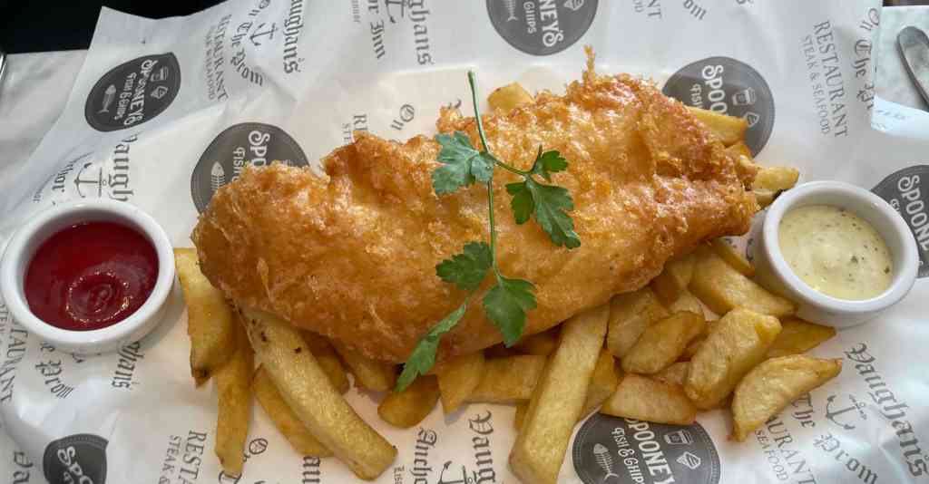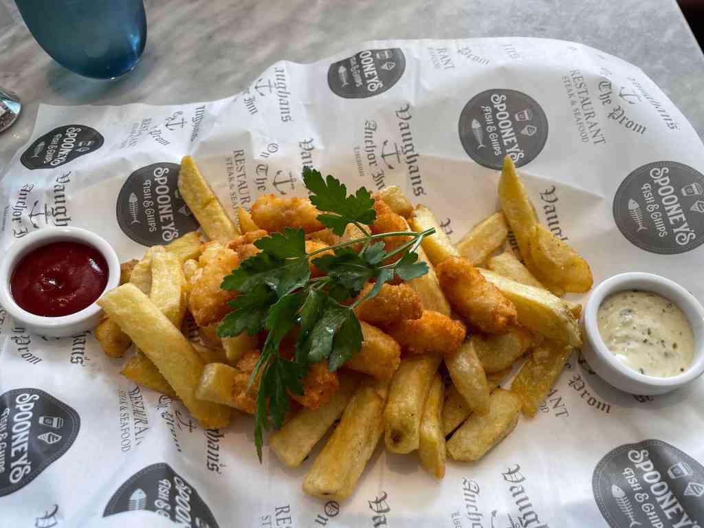 After Lahinch, we made our along the main road towards the village of Liscannor, which has a few places to grab a bite to eat as well as some places to stay. However, Vaughan’s Anchor Bar is worth popping in for the really good fish ‘n’ chips. We arrived in time for lunch and I opted to try their seafood chowder – which was actually dreadful, it was not chowder, it was fish soup. Thankfully though, the fish and chips which C went for were excellent. I decided to be a little retro and got scampi. While the scampi were fine, C’s fish ‘n’ chips were fantastic. They have other items on the menu, but really, just have the fish ‘n’ chips, or just the chips, if you don’t eat anything else – you know who you are :-).