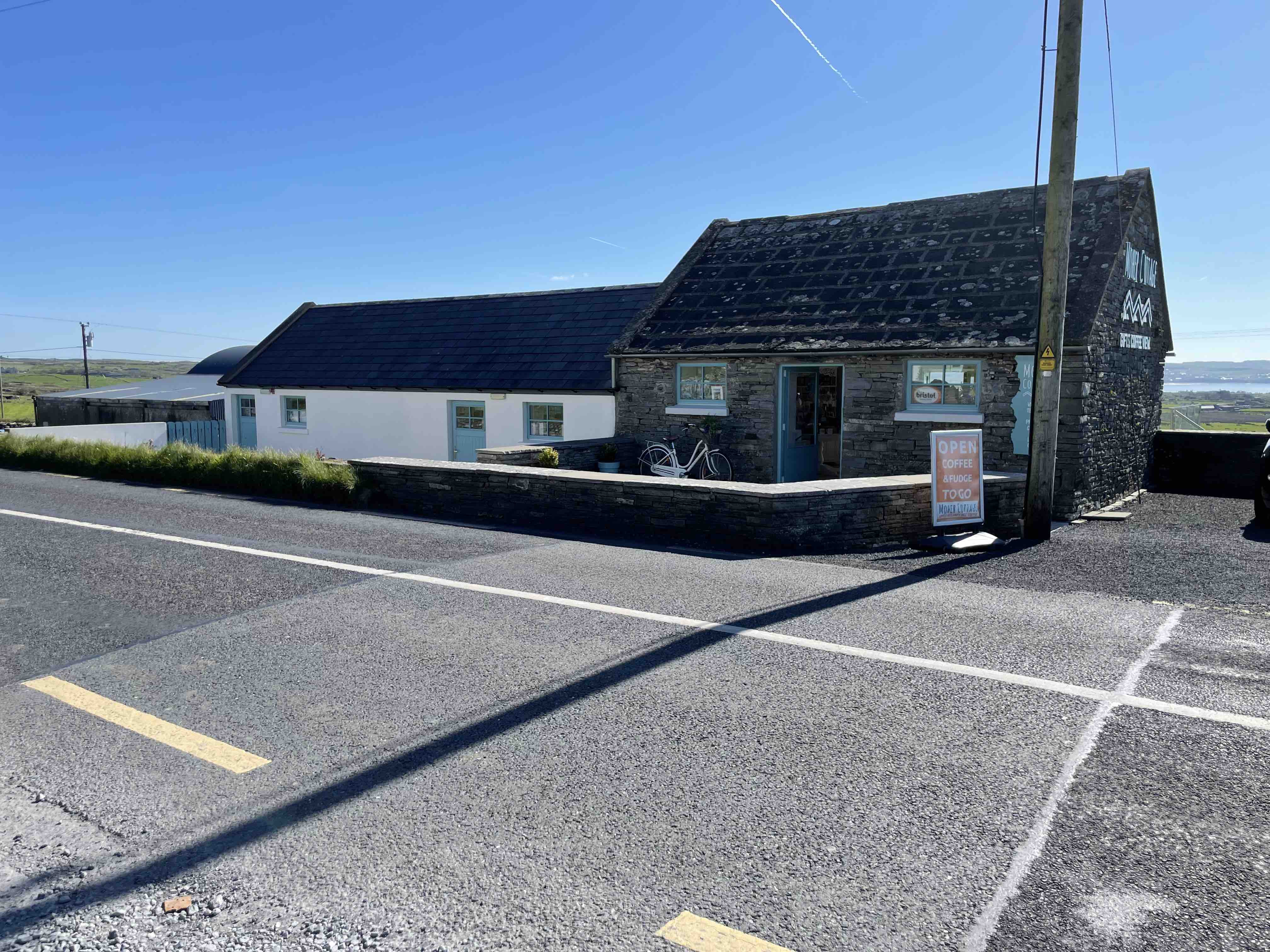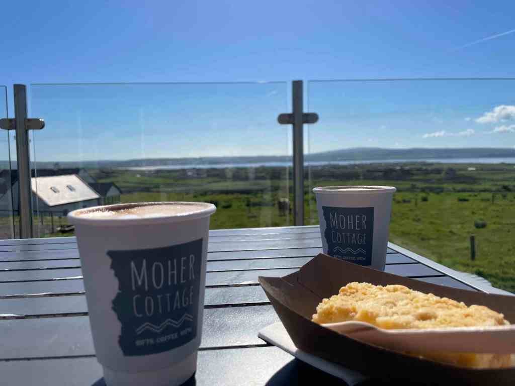 We hit the road with all the windows down in the car – yes, the weather was that good and with some really nice tunes playing, it made for a fantastic drive. We were now on our way back to Lahinch, but not without a stop at Moher Cottage coffee shop. A few years previous, on a national radio station, they asked listeners to send in where was the best coffee in Ireland – and well, Moher Cottage came out with the most votes. As well as coffee, some cakes and ice cream they have a small gift shop. We both went for a flat white and although I was still pretty full after breakfast, I decided to try their apple slice. The coffee was tasty, not the best I’ve had in Ireland, but a decent cup – the apple slice was nothing special, however, the view in the outdoor seating area (there’s no indoor seating) was delightful.